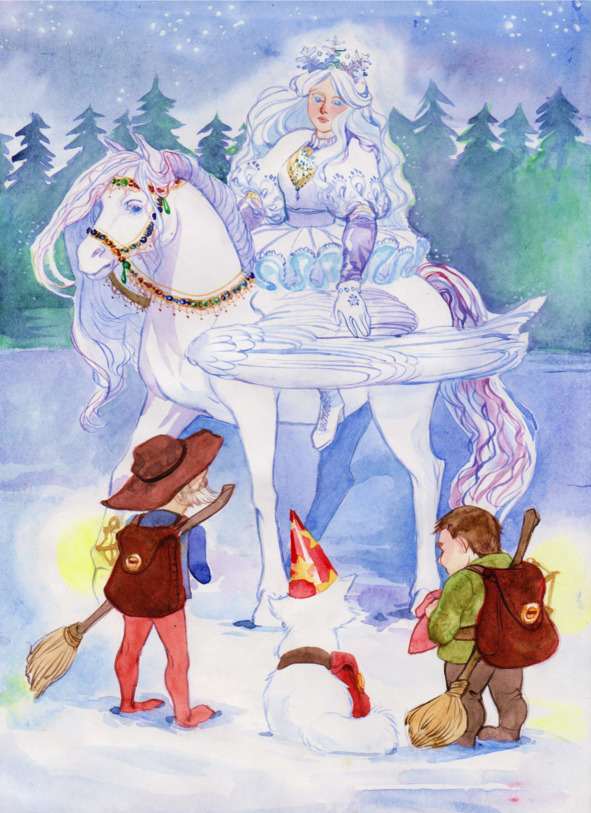 И вот на заснеженную полянку опустилась на серебристой крылатой лошадке Новогодняя Фея.