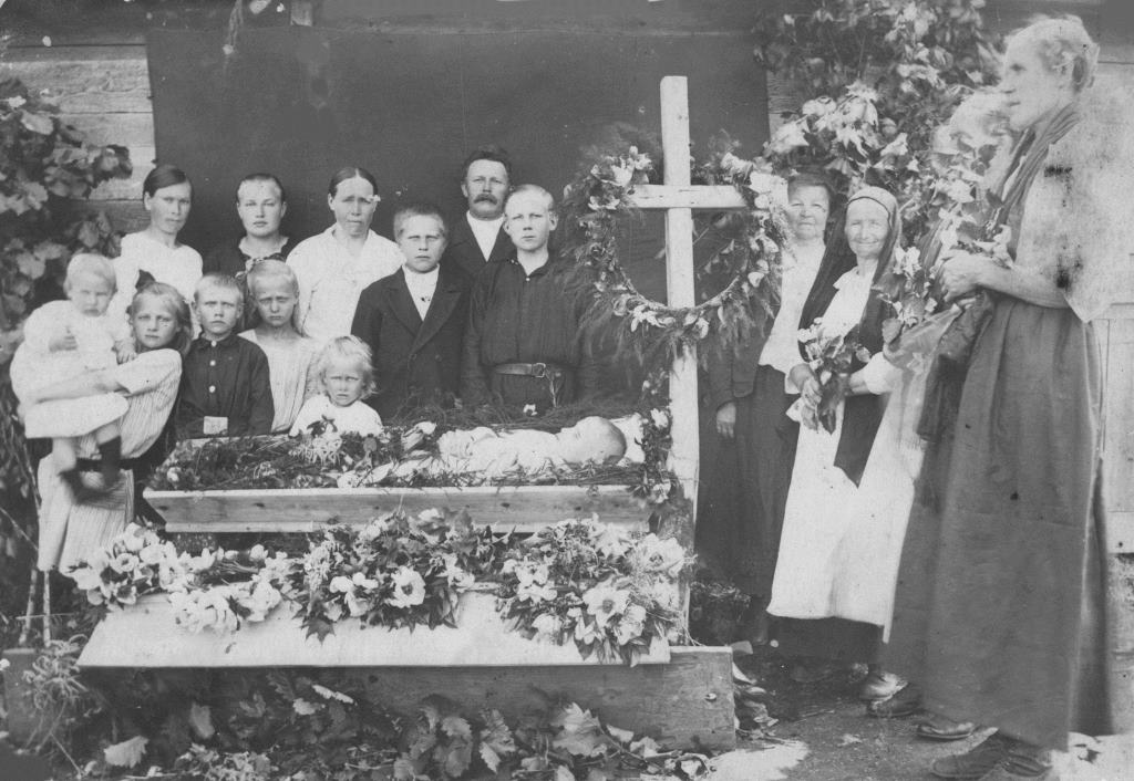 1922 год. Похороны мальчика Шоберг. За гробом справа налево Матс и Анна Шоберг, их дочь Анна, неизвестная женщина (возможно, дочь Марта), ниже стоят сыновья и дочери Линда (самая маленькая), Сальма, Ловиза с Германом на руках.