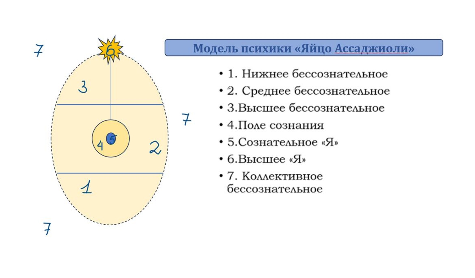 Все, что мы знаем о себе, своих мыслях, чувствах и поведении, относится к сознательному уровню нашего ума. Мысли, чувства, ощущения, воспоминания, фантазии, которые мы осознаем. Но помимо этого сознательного уровня, у нас есть еще и бессознательное. Бессознательное это скрытый подсознательный уровень нашего ума, который влияет на наши решения, поведение и эмоции, мысли, чувства, ощущения, воспоминания, фантазии, травмы, убеждения, образы, которые мы не осознаем, но которые управляют нами и во многом определяют нашу жизнь. Бессознательное пишет сценарий нашей жизни. Чтобы лучше представить, о чем мы говорим, обратимся к модели психики, потому что так уж человек устроен, что ярче воспринимает наглядную информацию. Был такой ученый Робе́рто Ассаджио́ли, итальянский психолог, психиатр, основатель психосинтеза теоретико-методологической концепции психотерапии и саморазвития человека. Именно ему принадлежит модель психики человека под названием «Яйцо Ассаджиоли». Это модель условная.