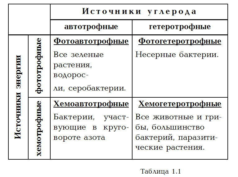 Способы саморегуляции. Согласно второму закону термодинамики, для саморегуляции любой упорядоченной системы, какой и является vita-система, и поддержания ее упорядоченности необходима энергия. Как известно этот процесс в биологии носит название гомеостаза. Для синтеза необходимых органических веществ живые системы используют два вида энергии световую и химическую (соответственно чему их называют фототрофными и хемотрофными). Сам процесс приобретения энергии называется питанием, а процесс высвобождения энергии из полученных с пищей веществ дыханием. Основной источник энергии живых организмов это углевод. Организмы, живущие за счет неорганического источника углерода, называют автотрофными, а за счет органического источника гетеротрофными. В таблице 1.1 показана классификация живых организмов в соответствии с источниками углерода и энергии. Таким образом, основной путь развития vita-систем определяется способом получения синтеза органических веществ. Как видно из таблицы, наиболее продуктивным с эволюционной точки зрения оказался хемогетеротрофный способ.