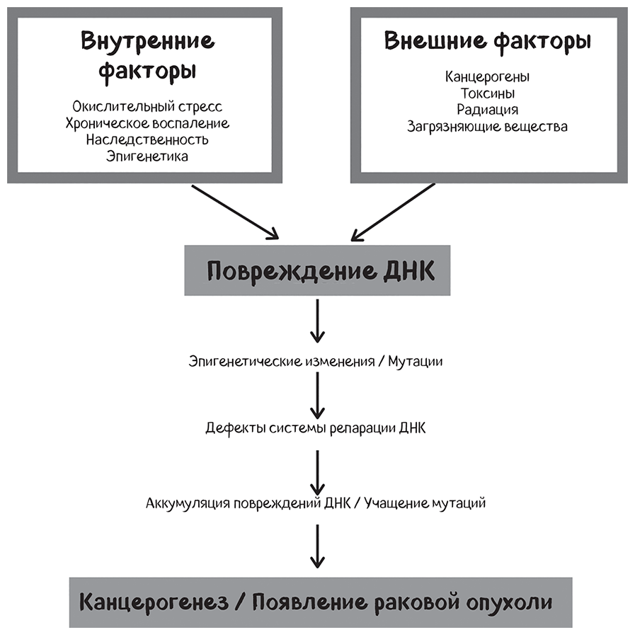 Эпигенетические изменения, связанные с развитием рака, едва ли имеют меньшее значение, чем генетические мутации. [327] К примерам таких изменений относятся метилирование ДНК, модификация гистонов, структурные нарушения хроматина и хромосомные мутации. [328] Они участвуют в регуляции экспрессии генов, не меняя последовательности ДНК. Снижение активности белков, участвующих в репарации ДНК, происходит на ранних стадиях развития рака и расшатывает генетическую стабильность. [329] В этой связи представляется особенно важным смягчение пагубного воздействия внешних факторов на ДНК, к которым относятся радиация, курение, вирусы и химические соединения, а также внутренние угрозы, среди которых активные формы кислорода и свободные радикалы. Дефекты системы репарации ДНК повышают частоту мутаций и делают клетки более уязвимыми для злокачественных превращений. [330] Это значит, что чем больше окислительного стресса и воспаления, тем больше требуется защитных антиоксидантов, чтобы сохранить здоровье.