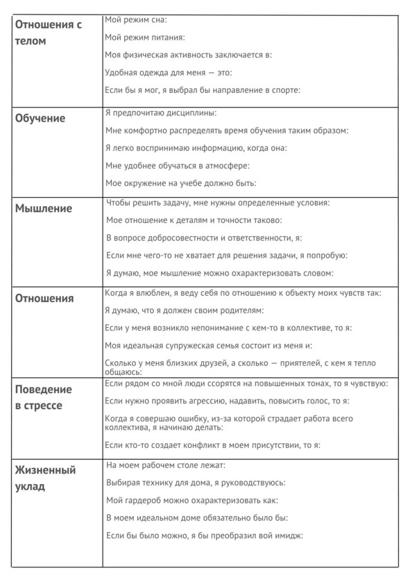 В этом вам поможет таблица. Отметьте в ней тезисно основные моменты, которые бросаются в глаза в вашем поведении, в вашем стиле жизни, общении, мышлении. Не торопитесь. У нас на это целая книга.