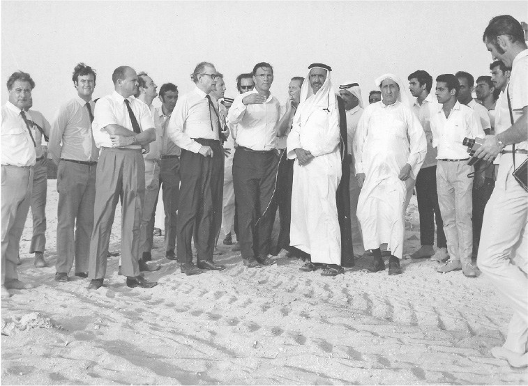 Шейх Рашид (в центре) на стройплощадке в окружении своих советников и экспертов, в том числе Джона Харриса и Уильяма Даффа (на переднем плане, второй и третий слева)