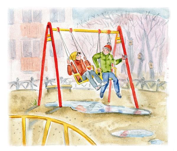 Ваня и Сёма покачались на качелях и несколько раз скатились с горки, пока их штаны совсем не промокли.