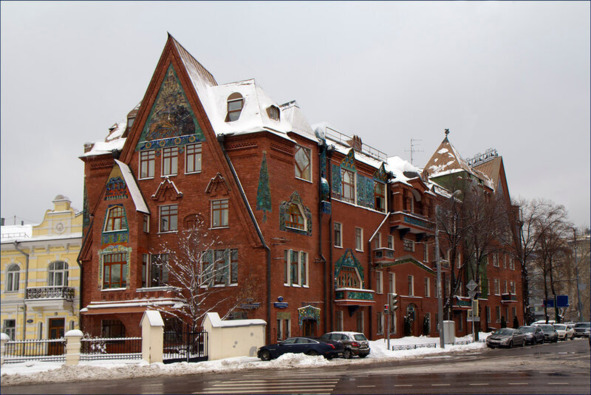 Построили его в 1905 году по эскизам художника Сергея Малютина. В облике дома много сложных разнообразных форм, но выглядит органично и законченно. Здесь можно встретить асимметричное расположение окон, балконов, богатый декор, башнеобразные выступы кровли. В подвале дома когда-то располагалось кабаре «Летучая мышь», а в мансардах были мастерские художников.