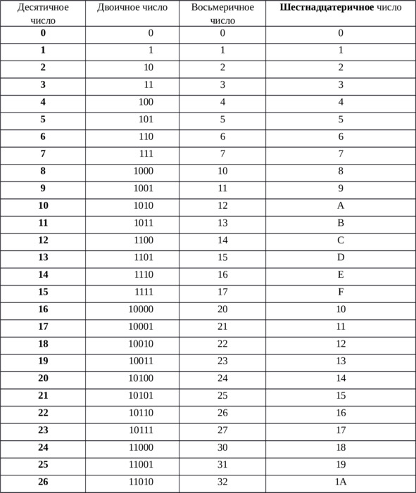 Запись чисел в десятичной, двоичной, восьмеричной и шестнадцатеричной системах счисления представлены в таблице кодирования.