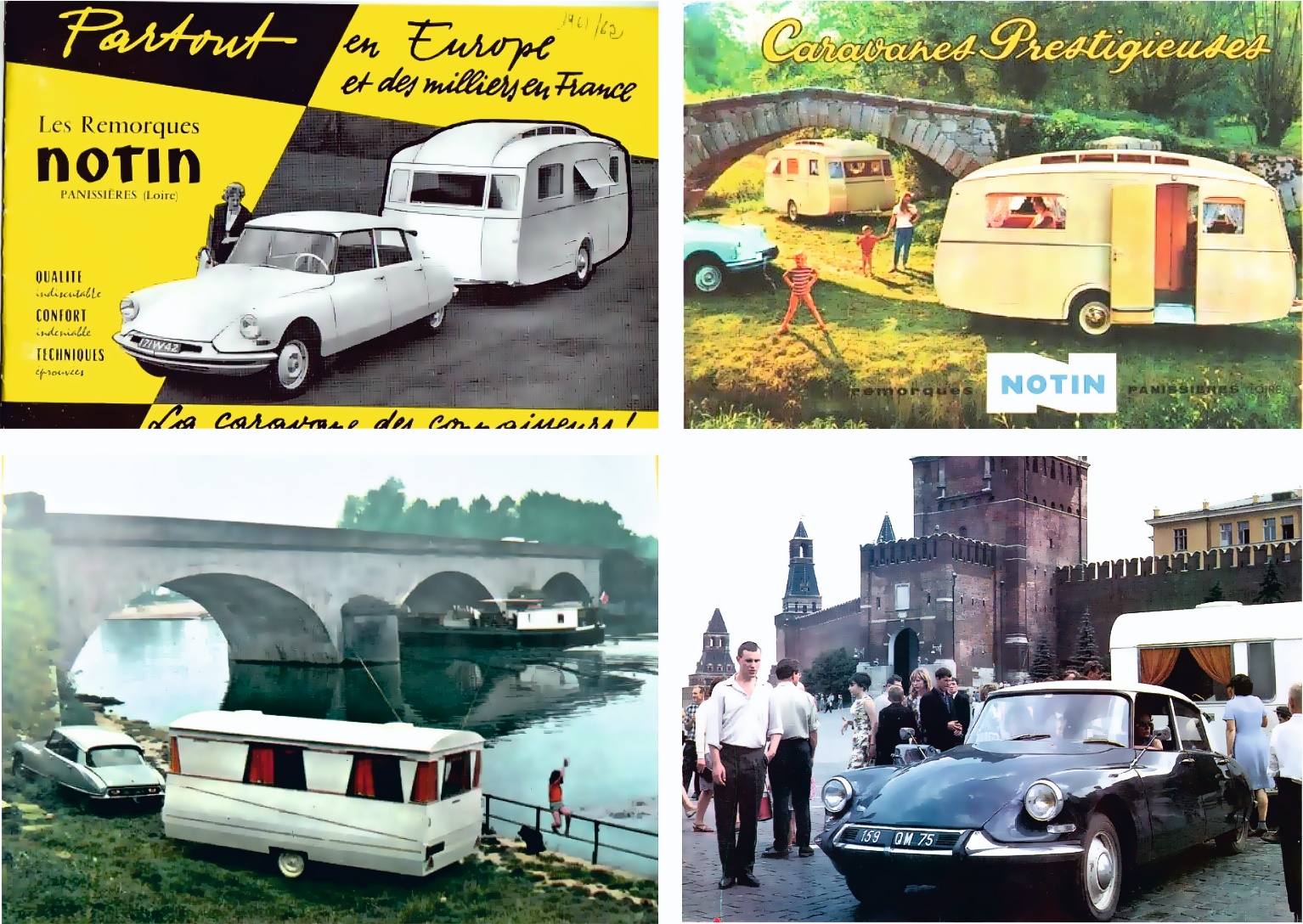 Рисунок 2.24. Французская марка «Notin»: сверху слева рекламный буклет к трейлеру «Pub Caravan», слева внизу караван «Georges et Jacques», сверху справа пресс-релиз по караванам компании; внизу справа: СССР, Красная площадь «Bellestar 1965».