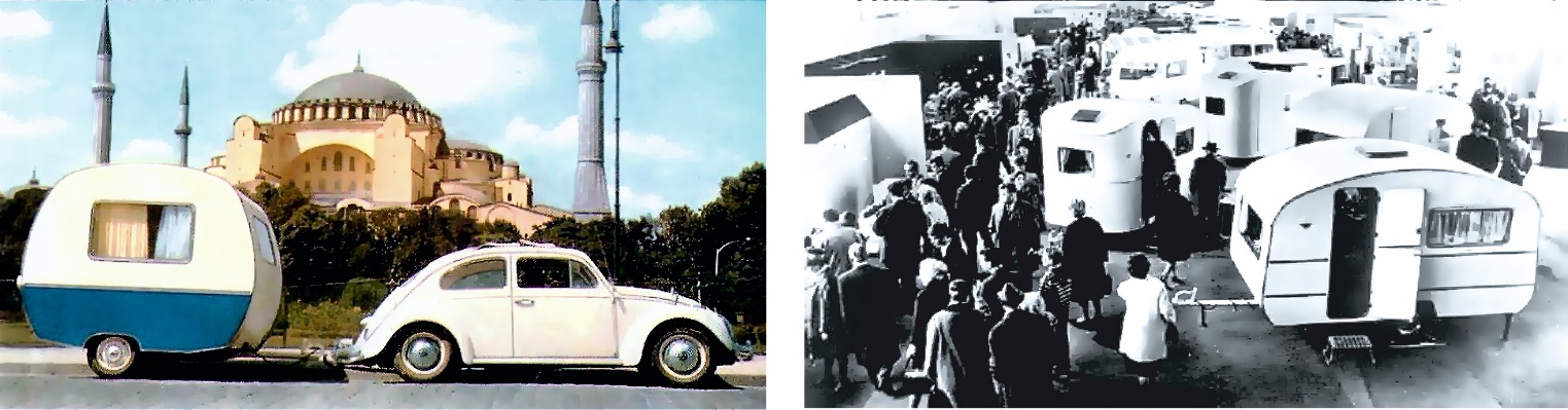 Рисунок 2.22. Слева: «VW Beetle» и жилой прицеп «Knaus». Справа: Первая выставка Караванов в Эссене, где Альфред Табберт выставляет свои жилые прицепы.