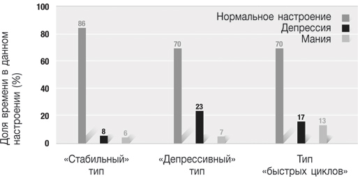 Остальные пациенты делились на две практически равные группы. Одна «депрессивного» типа, у которой на протяжении 23 % от общего времени наблюдались хотя бы какие-то симптомы депрессии. Вторая группа пребывала в ремиссии 70 % времени, а период клинических проявлений примерно в равных частях был представлен симптомами депрессии и мании. Эту так называемую группу «быстрых циклов» составляли пациенты с более частыми, но короткими периодами обострения. Как упоминалось выше, «стабильная» группа наблюдалась на протяжении многих лет и хорошо отвечала на лечение препаратами лития. Возможность достоверного выделения больных, которые хуже реагируют на применение лития, может оказаться полезной для поиска эффективной терапии (рис. 2.3).