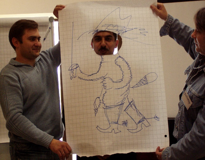 Работают две, или более команды. Они изображают на листе флипчарта некий широко известный персонаж (мультипликационный, сказочный) и предлагают одному из участников другой команды с помощью исключительно открытых вопросов (закрытые вопросы штрафуются) понять, кто же он? Как видно на фото, сам испытуемый не видит изображение. Упражнение имеет ряд особенностей, позволяющих несколько отрезвить участников, декларирующий умение задавать открытые вопросы. Оказавшись на виду всей группы в условиях ограничения по времени, далеко не каждый справляется с заданием в условленные 2 минуты
