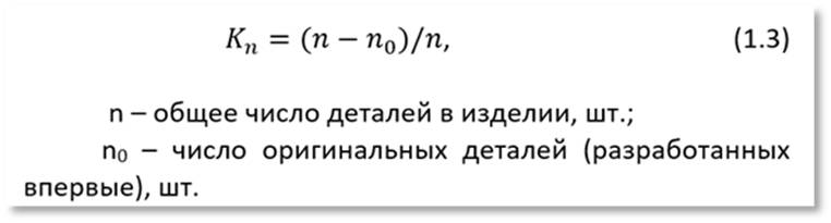 Основные положения» (Стандарт СССР) установлены основные этапы проведения работ по унификации. Под уровнем унификации изделий понимается насыщенность их унифицированными составными элементами: деталями, узлами, агрегатами, модулями. Уровень унификации определяется рядом показателей, таких как: коэффициент применяемости, коэффициент повторяемости, коэффициент межвидовой унификации, коэффициент унификации группы изделий. Основным является коэффициент применяемости, который вычисляют по формуле:
