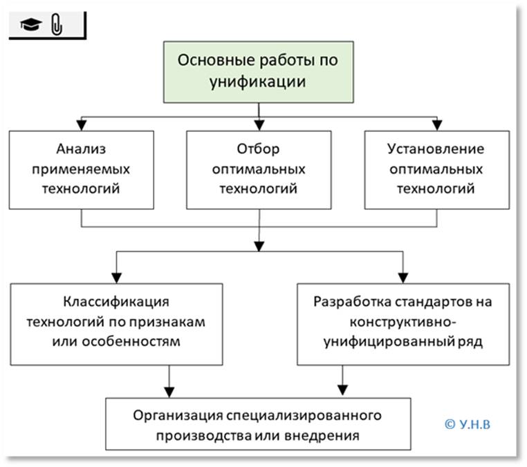 Метод унификации относится к наиболее распространённым методам стандартизации. Результаты унификации не всегда регламентированы в стандартах. Это могут быть альбомы типовых конструкций деталей, узлов, сборочных единиц, типов, параметров, конструкций. В зависимости от области проведения унификации изделий она может быть межотраслевой, отраслевой и заводской. На рисунке 1.35 представлены основные работы по унификации с позиции специалиста в информационной безопасности.