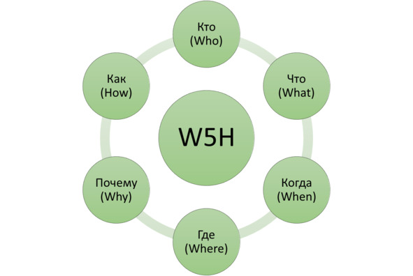 Еще один подход к формулированию вопросов это метод «W5H», который использует ключевые вопросительные слова: «кто, что, когда, где, почему, как» (рисунок 5). Задавая вопросы, используя эти слова, можно более глубоко исследовать текст и выявить темы, требующие дополнительного изучения или уточнения. Например, при чтении учебника по истории вы можете задать вопросы вроде «Кто были ключевые фигуры на этом историческом этапе?» и «Что стало основной причиной конфликта?». Метод «W5H» помогает полнее раскрыть содержание изучаемого материала.