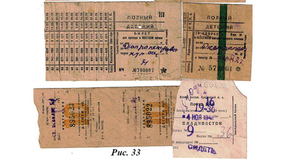 Отцу всю жизнь приходилось много ездить. Да и всей семьей мы ездили немало. Странным образом в семейном архиве сохранились железнодорожные билеты разных лет. «Странным», потому что большинство людей подобные вещи не хранит. Во всяком случае, не хранит их десятилетиями, перевозя с собой из города в город. Но у нас в семье немало подобных вещей. Главным собирателем и хранителем архива была, конечно, мама. Вряд ли у нее имелось осознанное стремление к созданию семейного архива, скорее, это просто проявление черты характера: ничего не выбрасывать «на всякий случай». Одно могу сказать: подобное иррациональное отношение ко всякой бумажке передалось и мне: берегу все. И вот теперь, рассматривая многое из нашего архива, в частности, эти билеты, без всякого самооправдания считаю их интересными документами эпохи, вполне заслуживающими и коллекционирования и музейного хранения. Из многих хранящихся билетов на рис. 33 детские билеты 1948 года: Днепропетровск-Ярославль через Москву. На них имеются все полагающиеся штампы, подписи и пробивки компостеров. Видимо, это билеты Павлика. Есть билеты на поезд Москва-Владивосток, причем сидячие. Это, скорее всего, поездки поездом дальнего следования до Костромы. Имеется и квитанция за штраф 10 рублей, взысканный на Ярославском вокзале «Всполье»: за провоз излишней ручной клади.