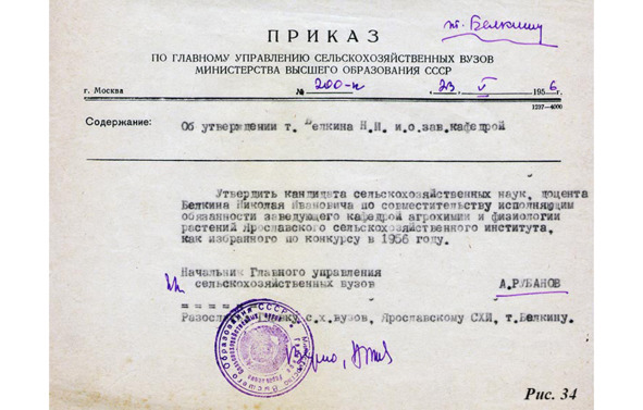 Из сохранившихся документов того времени приведу приказ, в очередной раз утверждающий отца в должности заведующего кафедрой. Дело в том, что каждые, кажется, пять лет надо было заново проходить конкурс на заведование кафедрой: подавать соответствующие документы, представлять их на утверждение и пр. С какого-то момента заведующий кафедрой становится «исполняющим обязанности»: прежний срок утвержденной должности истек, а новый ещё не наступил. Вот и выпускается соответствующий приказ об утверждении «исполняющим обязанности» заведующего кафедрой (рис. 34).