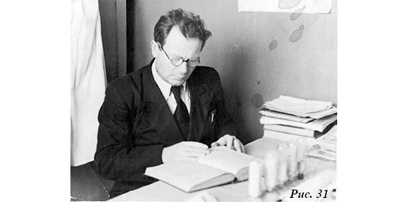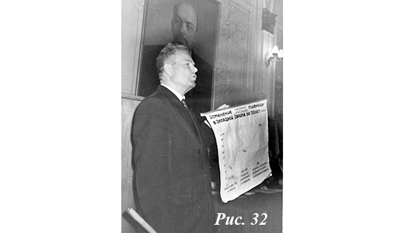 Приведу ещё две фотографии (рис. 31 и 32). На первой отец за столом лаборатории, на второй выступает на конференции. В те времена ещё не были распространены слайды и проекционная аппаратура. Все, что надо, делалось вручную в виде бумажных плакатов, прикрепленных к деревянным рейкам. Такой плакат, снабженный веревочкой, можно было подвесить или держать в руке как отец на фото. Все плакаты, а также реечки и веревочки отец делал сам. Потом то же самое, когда пришло время, делали и мы Павел, Саша и Сережа.