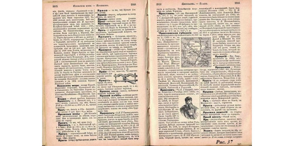 Надо отметить, что отец был весьма образованным человеком. Он всегда много читал, всю жизнь собирал домашнюю библиотеку. Вернее домашние библиотеки. О судьбе довоенной библиотеки я писал во втором томе. После войны он принялся снова покупать книги. Эту любовь к книгам и стремление к воссозданию домашней библиотеки в полной мере разделяла и мама. Она с самого раннего детства приучала нас не только читать и любить книги, но и пользоваться словарями и энциклопедиями. Буквально настольной книгой для каждого из нас стал четырехтомный «Словарь русского языка» под редакцией проф. Ушакова. На всю жизнь и я, и мои братья запомнили надписи на корешках каждого тома: «АКЮРИНЫ», «ЛОЯЛОВЕТЬ», «ПРЯШКА», «СЯЩУРНЫЙ». Каждый том был надписан мамой еще до войны: «Л. П. Христофоровой». Кроме того, в одном из томов хранился плакат времен Великой Отечественной войны. Он оказался там, видимо, случайно, но остался как объект архивного хранения. Это известнейшая работа Корецкого «Воин Красной армии, спаси!» Там нарисована женщина, прижимающая к груди ребенка, на которого направлен немецкий штык со свастикой. Я искренне, по-настоящему боялся этого плаката как жуткой возможности наступления изображенного на нем события непосредственно со мной и мамой. Мы также часто пользовались «Энциклопедическим словарем» Ф. Павленкова 1907 года издания. Вспомнив о нем, приведу здесь статью о Ярославле и фото разворота страниц словаря (рис. 37):