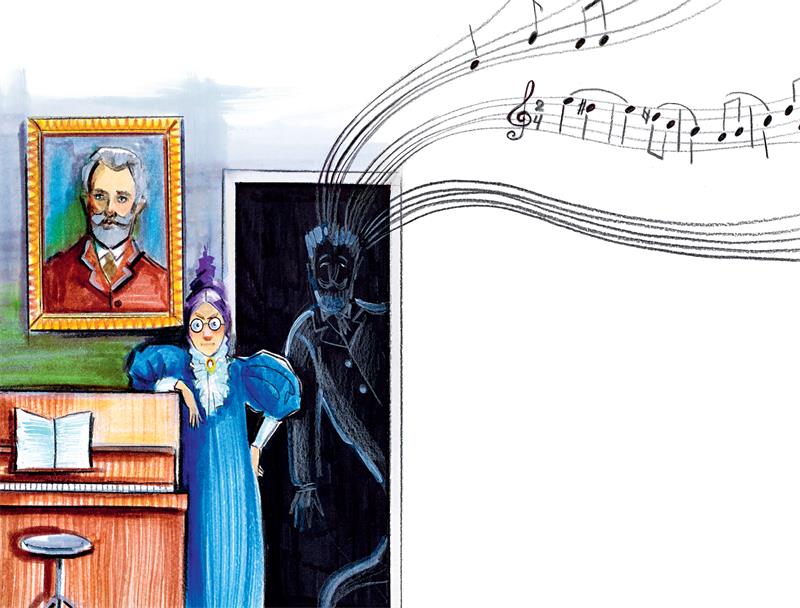 Чайковский удивился, сел за парту рядом с Сёмой. А тетради-то и нету никакой у Чайковского. Откуда у призраков тетради? Сёма поделился с Чайковским листочком и ручкой, композитор Сёму поблагодарил и стал что-то быстро-быстро записывать. А музычка подходит к их парте, выхватывает листочек у Чайковского и говорит грозным голосом:
