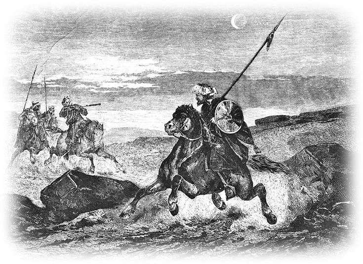 Так говорили между собой в палатке путники, а стража, расставленная вокруг места привала, начала беспокоиться. На расстоянии получаса показалась довольно значительная кучка вооружённых всадников; они ехали, по-видимому, прямо к лагерю. Поэтому один из людей стражи пошёл в палатку известить, что они, вероятно, подвергнутся нападению. Купцы стали совещаться между собой, что им делать: идти ли навстречу всадникам или подождать нападения.