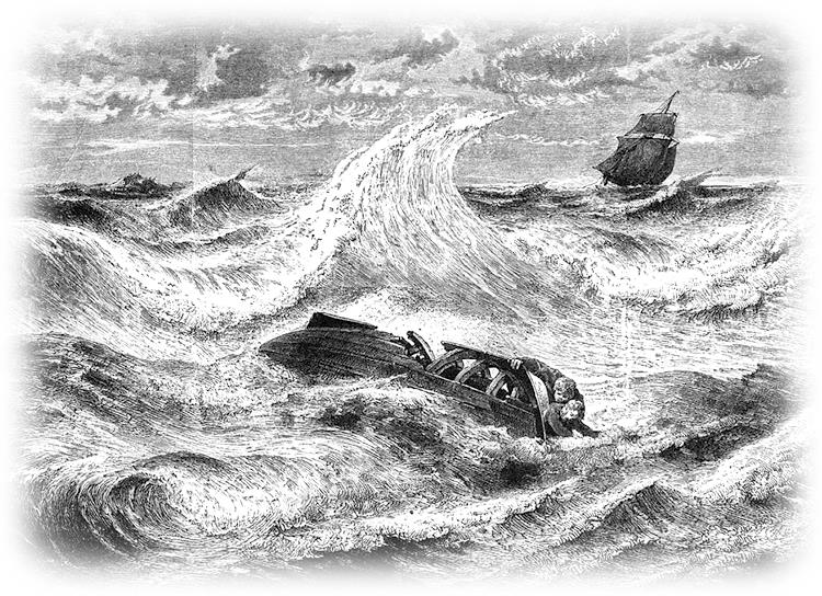 Наконец наступил день. Но с первым проблеском утренней зари ветер подхватил лодку, в которой мы сидели, и опрокинул её. Никого из своих моряков я уж не видал. Падение оглушило меня, а когда я очнулся, то находился в объятиях своего старого, верного слуги, который спасся на опрокинутую лодку и вытащил за собою меня.