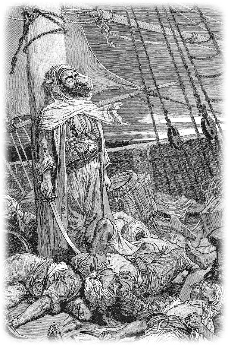 На носу корабля свешивался длинный канат. Мы стали руками и ногами грести, чтобы схватить его. Наконец это удалось. Я ещё раз возвысил голос, но на корабле всё оставалось тихо. Тогда мы стали взбираться по канату наверх; я, как более молодой, впереди. О ужас! Какое зрелище представилось моим глазам, когда я вступил на палубу! Пол был красен от крови; на нём лежало двадцать или тридцать трупов в турецких одеждах; у средней мачты стоял человек, богато одетый и с саблей в руке, но его лицо было бледно и искажено, а через лоб проходил большой гвоздь, которым он был прибит к мачте, и он был мёртв. Ужас сковал мои шаги, я едва смел дышать. Наконец и мой спутник взошёл наверх. И его поразил вид палубы, на которой совсем не было видно ничего живого, но лишь столько ужасных мертвецов. Наконец, помолившись в душевном страхе Пророку, мы решили пройти дальше. На каждом шагу мы оглядывались, не представится ли чего-нибудь нового, ещё ужаснее. Но всё оставалось так как было нигде ничего живого, кроме нас и океана. Мы даже не решались громко говорить из страха, что мёртвый, пригвождённый к мачте капитан направит на нас свои неподвижные глаза или один из мертвецов повернёт голову.