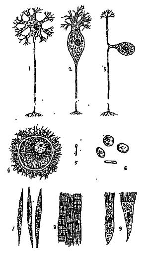6 красные кровяные тельца; 7, 8 клетки мышц; 9 реснитчатые клетки эпителия.