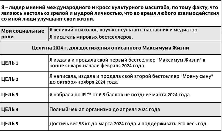 Мы идем сверху вниз. Разберем первую строку, она и есть тот самый Максимум Жизни. Сверх цель, превышающая все мои нынешние возможности, тот «Эверест», до которого только смогло дотянуться мое внутреннее позволение после определенной практики погружения. С ней вы познакомитесь ниже.