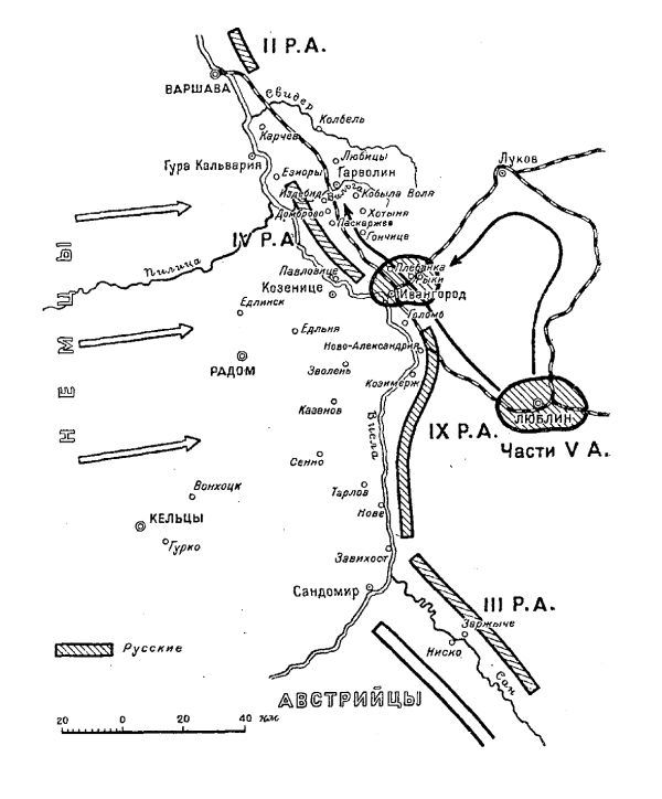 В 1914 г. в конце сентября русский юго-западный фронт отбросил австро-венгерскую армию и, преследуя ее, дошел; до верхней Вислы и Сана. Центр русского фронта средняя Висла и район к западу от нее оказался слабо обеспечен и потребовал срочной перегруппировки сил для парирования наметившегося удара германско-австрийских войск. Директивой командующего фронтом вся 5-я армия в составе 4 корпусов и 1 кавдивизии должна была перейти в район Люблин Красник и образовать новый участок фронта.