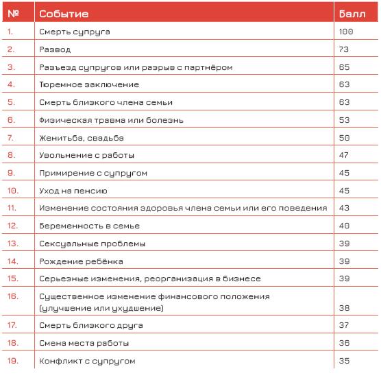 Понимая всё это, я думаю, вы не слишком удивитесь, посмотрев на шкалу стресса, разработанную двумя американскими психиатрами Томасом Холмсом и Ричардом Рэем.