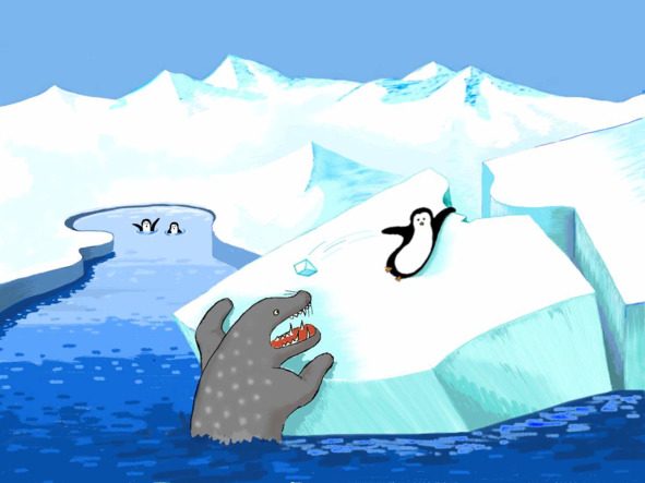 Я в ужасе оглянулся леопард рычал, неистово пытаясь меня достать. Я отбил клювом кусочек льда и швырнул им в леопарда. Получив по носу, леопард соскользнул в воду, сильно оттолкнув от берега часть айсберга, на которой я находился.