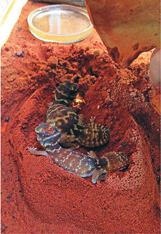 При использовании толстого слоя грунта в террариуме обязательно наличие нижнего дренажного слоя с древесным углём, керамзитом или мелкой галькой. При использовании в качестве субстрата для пустынных видов чистого песка, нет необходимости увлажнять весь объем грунта, а вполне достаточно это сделать в местах укрытий гекконов. Смесь песка с глиной и добавление кокосового торфа, пожалуй, один из лучших субстратов для наземных роющих видов. Глина выступает в качестве закрепляющего компонента, сохраняя форму вырытых нор, что особенно важно для роющих видов, а кокос отлично справляется с аккумуляцией влаги в грунте. Кстати, песок Namiba Terra идет уже с добавлением глины и отлично подходит для этих видов гекконов.