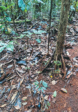 Сухие листья на субстрате снижают испарения с его поверхности, тем самым поддерживая уровень влажности. На наш взгляд, размещение на субстрате в террариуме листьев приносит только положительные моменты как для визуального эффекта (террариум смотрится намного естественнее и красивее), так и с точки зрения сохранения биобаланса, так как, обладая антибактериальной активностью, они подавляют рост многих нежелательных микроорганизмов и грибов. Достаточно гармонично смотрится участок мертвопокровного леса в провинции Нумеа, Новая Каледония.