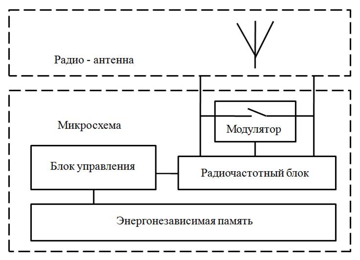 Главными конструктивными элементами, определяющими работу метки РЧИ, являются интегральная схема и антенна. Можно сказать, что метка состоит из интегральной схемы, подключенной к антенне. В состав интегральной схемы входит блок управления, энергонезависимая память, радиочастотный блок и модулятор, как показано на рисунке 7.