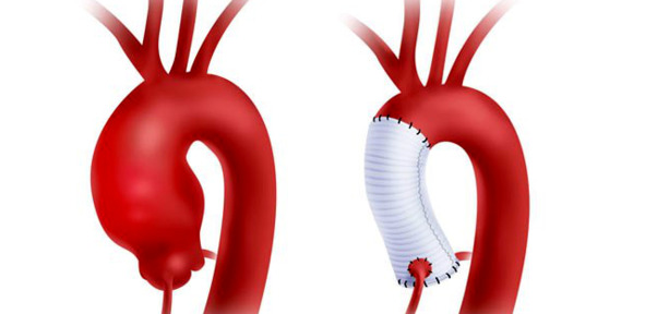 Атеросклероз на аорте, повышенное АД, плюс курение три фактора соединяясь, приводят к грозному осложнению аневризма аорты или диссекция аорты. Аневризма это расширение аорты и истончение ее стенки. Диссекция это когда внутренняя стенка сосуда отслаивается от более глубоких слоев. Оперируется протезированием восходящего участка аорты или устанавливается стент графт (рисунок 4).