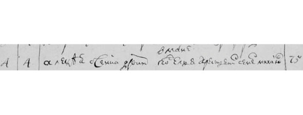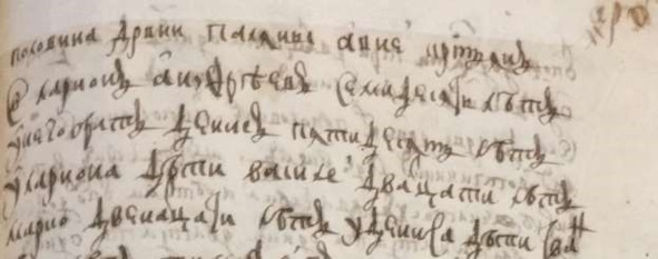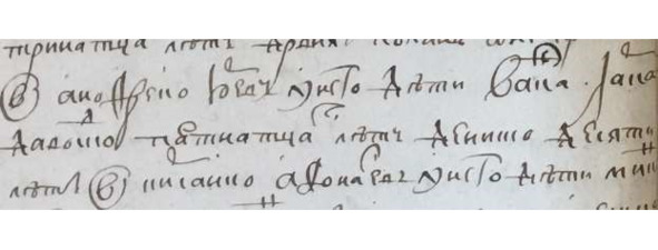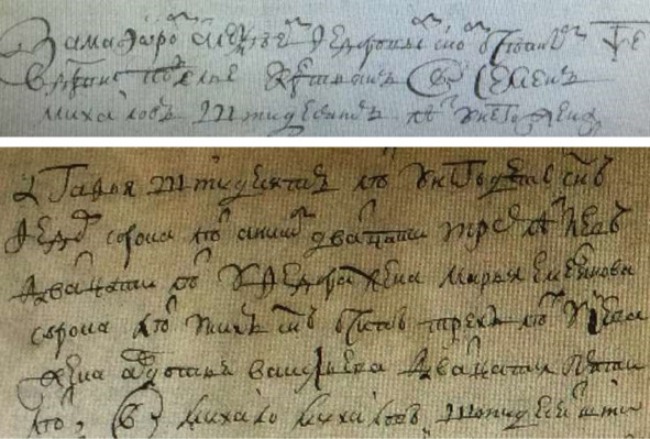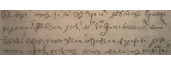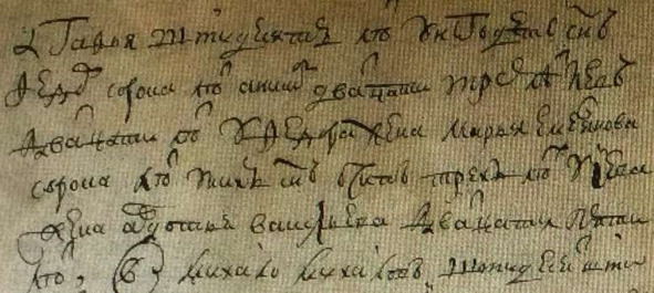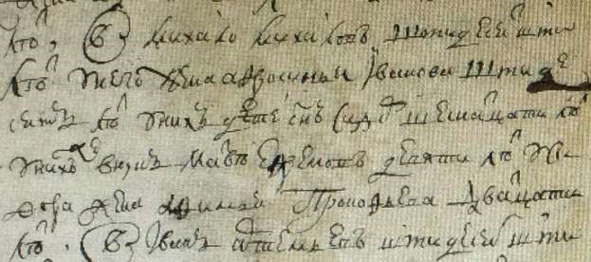 1717 г. «Михайло Михайлов штидесят шти лет У него жена Афросинья Иванова штидесят лет у них детей сын Сидор шестнатцати лет»