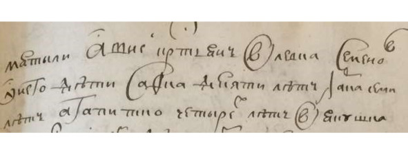 Переписная книга 1678 г. «Мятыли А в ней крестьян Во дворе Левка Семенов у него дети Сафка десяти лет Ларка семи лет Агапитко четырех лет».