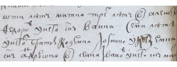 Переписная книга 1678 г. «Алешка Федоров у него сын Ванка семи лет у него братья Коземка Логинко У Коземки сын Андрюшко».