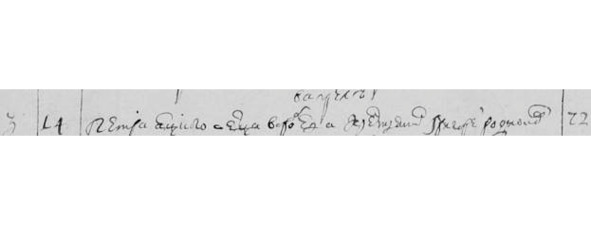 МК 1726 г. «В апреле. 14. Петра Яцкого сц. Воробьева кр. Григорий Родионов. 72».