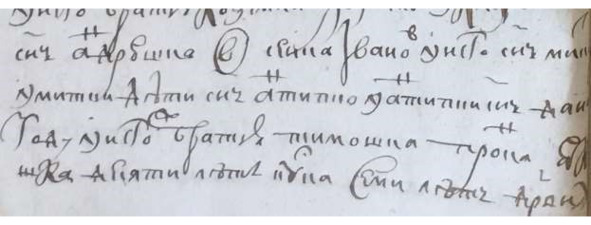 Переписная книга 1678 г. «Во дворе Сенка Иванов у него сын Митка У Митки дети сын Антипко у Антипки сын Данилко году у него же братья Тимошка Пронка Якушка десяти лет Кузка семи лет».