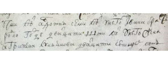 1717 г. Книга переписная «в сц. Воробьеве у него ж Ивана брат родной Гордей дватцати шти лет у него жена Агрипена Лукьянова дватцати четырех лет».