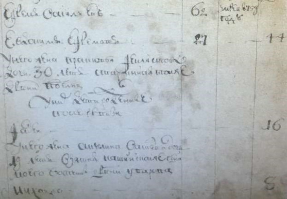 Ревизская сказка 1762 г. д. Подъелья «Ефрем Васильев. (62). Умер 759 г. Евдоким Ефремов