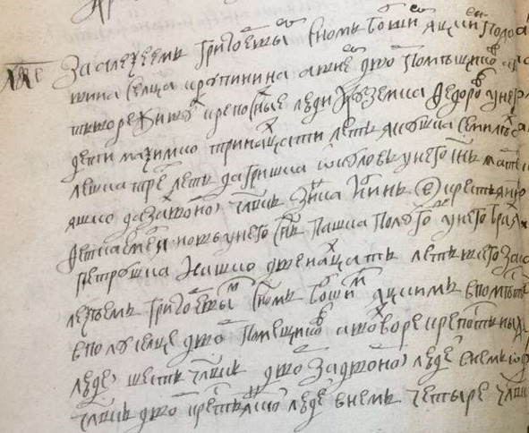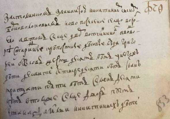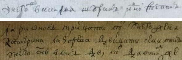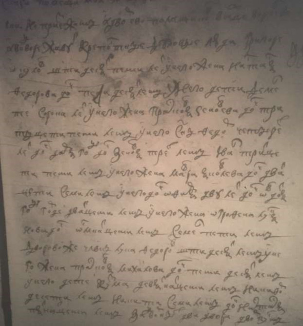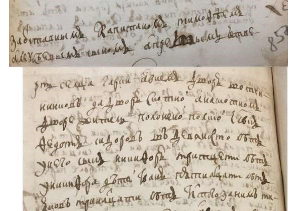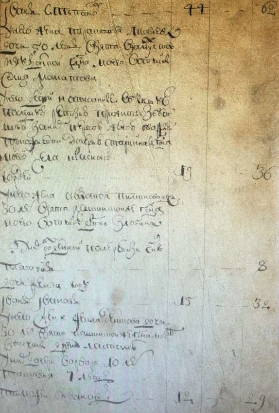 Книга переписаная 1717 г. сц. Воробьева. «В бегах Григорей Родионов штидесят лет Клим Матвеев семидесят пяти лет Иван Тарасов сорока лет у него жена Матрена тритцати лет дочь Настасья шти лет».