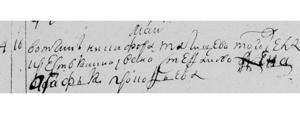 МК 1739 г. «Май.16. Вотч. Никифора Татищева того села кр. Ивана Стефанова жена Агафья Прокофьева».