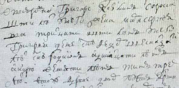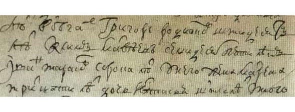 Книга Переписная 1717 г. «Григорей Козмин сорока шти лет у него жена Марья Сергеева тритцати шти лет у него Григорья детей сын Федор шестнатцати лет сын Родион одинатцати лет Андрей девяти лет Тит трех лет».