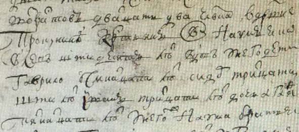 Книга переписная 1717 г. «Наум Яковлев штидесят лет вдов, у него дети Гаврило осмнатцати лет, Сидор тритцати шти лет, Иван Тритцати лет, дочь Агафья пятнатцати лет».