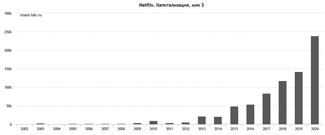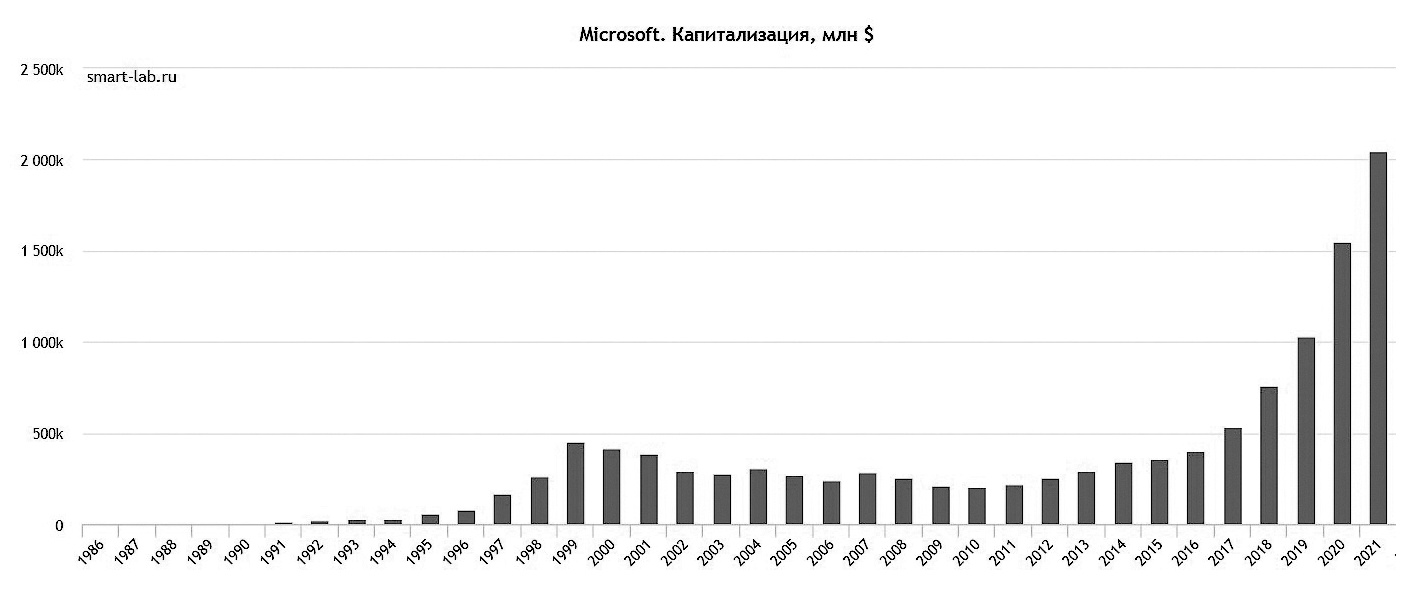 Давайте еще посмотрим на графики капитализации. Следующая картинка показывает, что Microsoft также успешно справилась с кризисом среднего возраста.