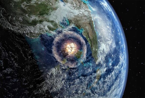 65 миллионов лет гигантский метеорит или комета врезались в Землю пронзающим ударом миллиона атомных бомб, при этом в Мексике в районе Чиксулуб, возник кратер диаметром в 160 километров, погибли динозавры и другие древние животные по всей Земле;
