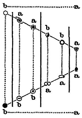 Учитывая эти общие соображения, давайте вернемся к вопросу о числе единиц на каждом иерархическом уровне. Я предлагаю выделить (довольно произвольно) два класса индивидов (а) «многочисленные», многие тысячи или миллионы которых требуются для создания индивида следующего уровня, и (б) «немногочисленные», очень мало которых (а иногда и вовсе лишь двоих) достаточно для этой цели. Когда такое разграничение проделано, начинают появляться новые структуры. Например, мы можем заметить, что человеческая Пара (аа) вместе с наивысшей Парой (bb) составляют сверх-Пару; что земным Парам (ba) (bа) соответствуют небесные Пары (ab) (ab); что иерархия таким образом делится на четыре вертикальных отдела божественный, небесный, земной и человеческий с явной границей посередине между концентрической Землей, Жизнью и Человечеством с одной стороны и эксцентрическими небесными единицами с другой. Здесь, по крайней мере, есть намеки на лежащий в основе всего этого порядок, на неожиданные космические полярности.