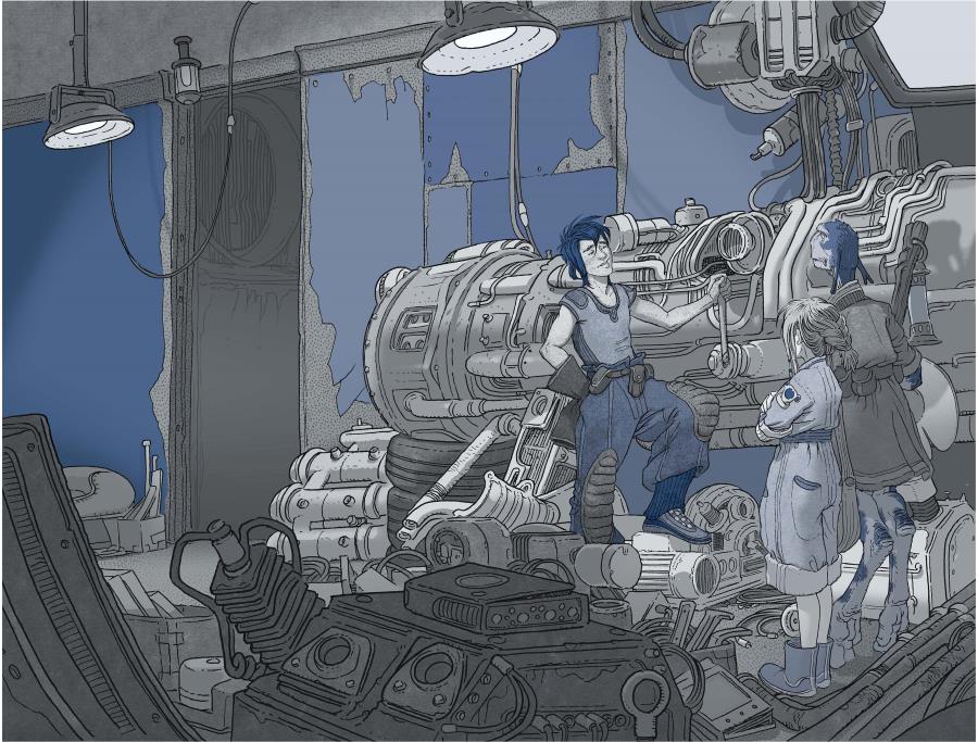 Как и во всем остальном жилище, убранство помещения составляли разрозненные детали развалившегося воздушного судна. Большую часть пространства занимал гигантский полуразобранный двигатель, взгроможденный на подставки из истертых шин. Хитроумные агрегаты и странного вида запчасти покрывали пол, так что между ними оставался лишь извилистый узкий проход. Перевернутые пустые ящики служили временными верстаками, и каждый был завален кучей инструментов. В дальнем конце комнаты бок о бок стояли две койки.