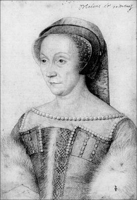 Диана родилась в одной из знатнейших семей королевства в 1499 году. Ее бабкой была Жанна де Латур де Булонь тетка матери Екатерины. Она была замужем за Луи де Брезэ, великим сенешалем Нормандии, но в 1531 году уже овдовела и вскоре после брака Генриха Орлеанского пленила его на всю жизнь. Но, естественно, никто не мог подозревать, что эта связь будет длиться до самой смерти Генриха в 1559 году (сама Диана умрет в 1566‐м); не знала и Екатерина, поэтому, как женщина умная, она не стала закатывать вульгарных сцен, понимая, что коса может найти на камень и что при подобной открытой атаке на чувство мужа она может одним ударом не только все выиграть, но и все потерять, и поэтому решила положиться на благодетельное время, зная, что, перегорев, пламя любви рождает пепел привычки, переходящей в прах забвения. Она запаслась терпением и ждала, наружно даже сохраняя хорошие отношения с соперницей, хотя, естественно, и не отказываясь от ведения тайной войны и мимолетных уколов, прикрытых иронией и остроумием. Рассказывают, что как-то Диана застала читающую Екатерину (дело было уже в те времена, когда муж ее был королем, она соответственно королевой, а Пуатье стала из пассии принца фавориткой короля такое постоянство, заметим, заслуживает уважения. Речь, разумеется идет о Генрихе).